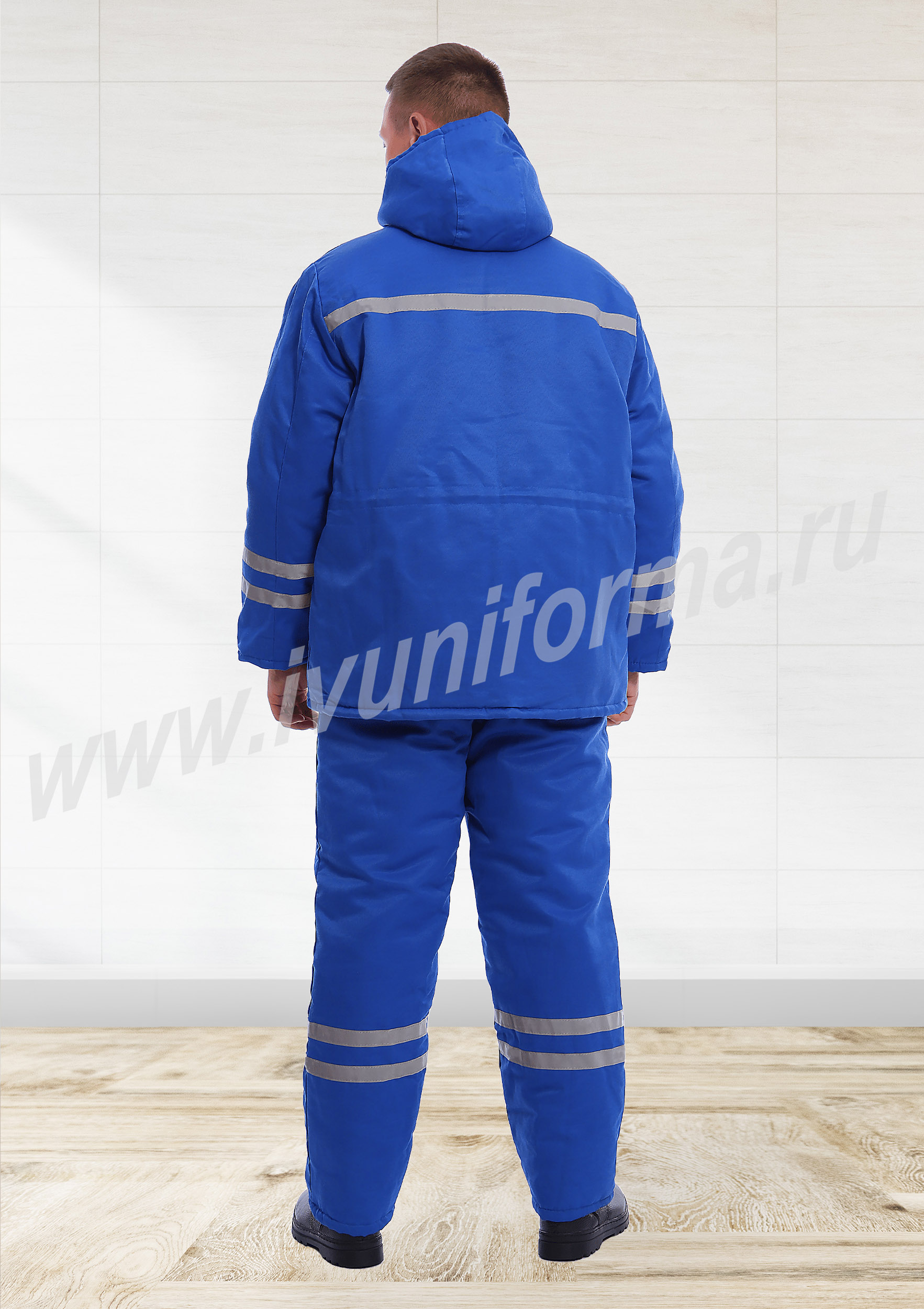 Брюки с высоким утепленным поясом, со шлевками под ремень, застежкой на две пуговицы и молнию. По низу брюк расположены две светоотражающие ленты. Утепление брюк 200 гр/кв.м.